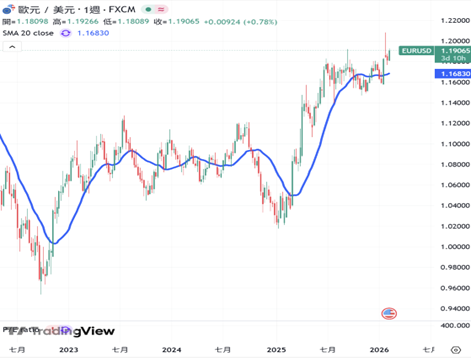 到了 2025 年底,歐元兌美元大約漲了一成五到一成八,來到了 1.18 左右的位置。進入 2026 年後,由於美元持續弱勢,歐元兌美元的價格仍然持續上漲。