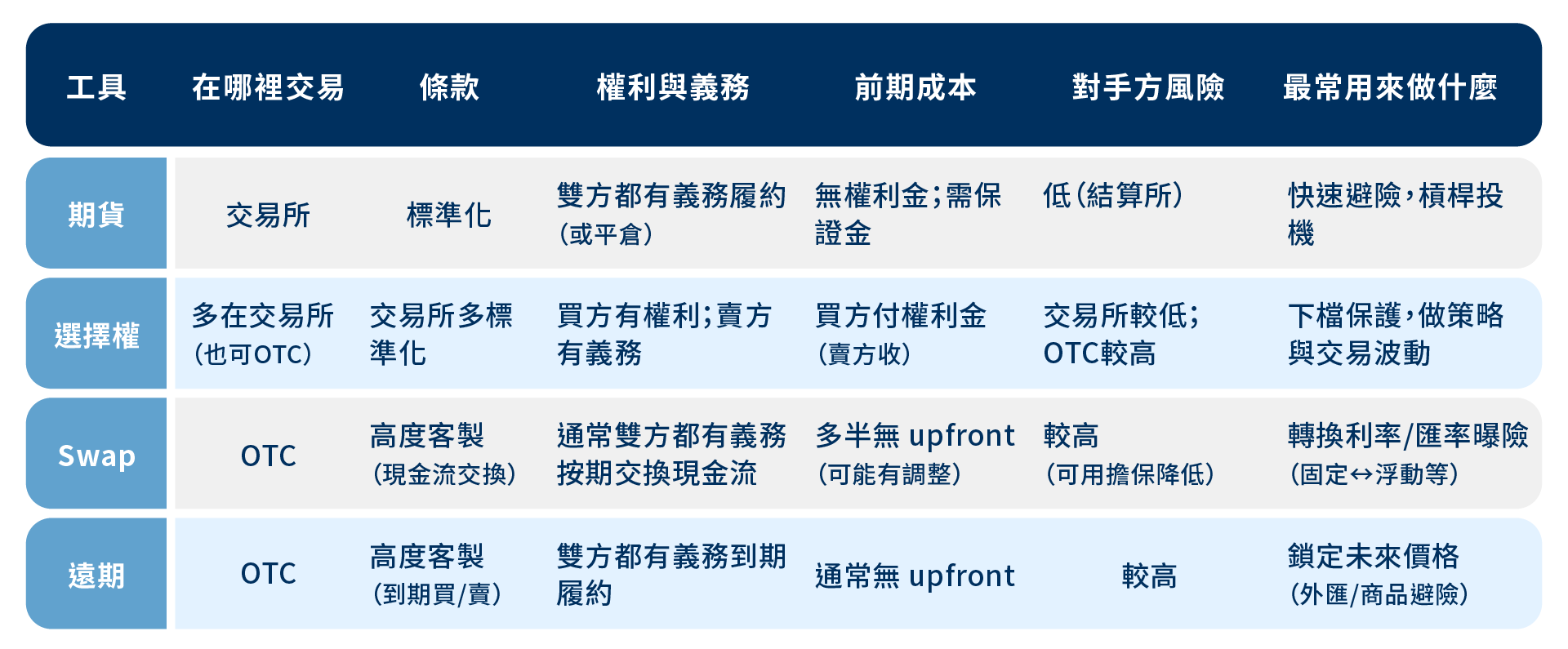 期貨、選擇權、Swap、遠期契約各避險的異同